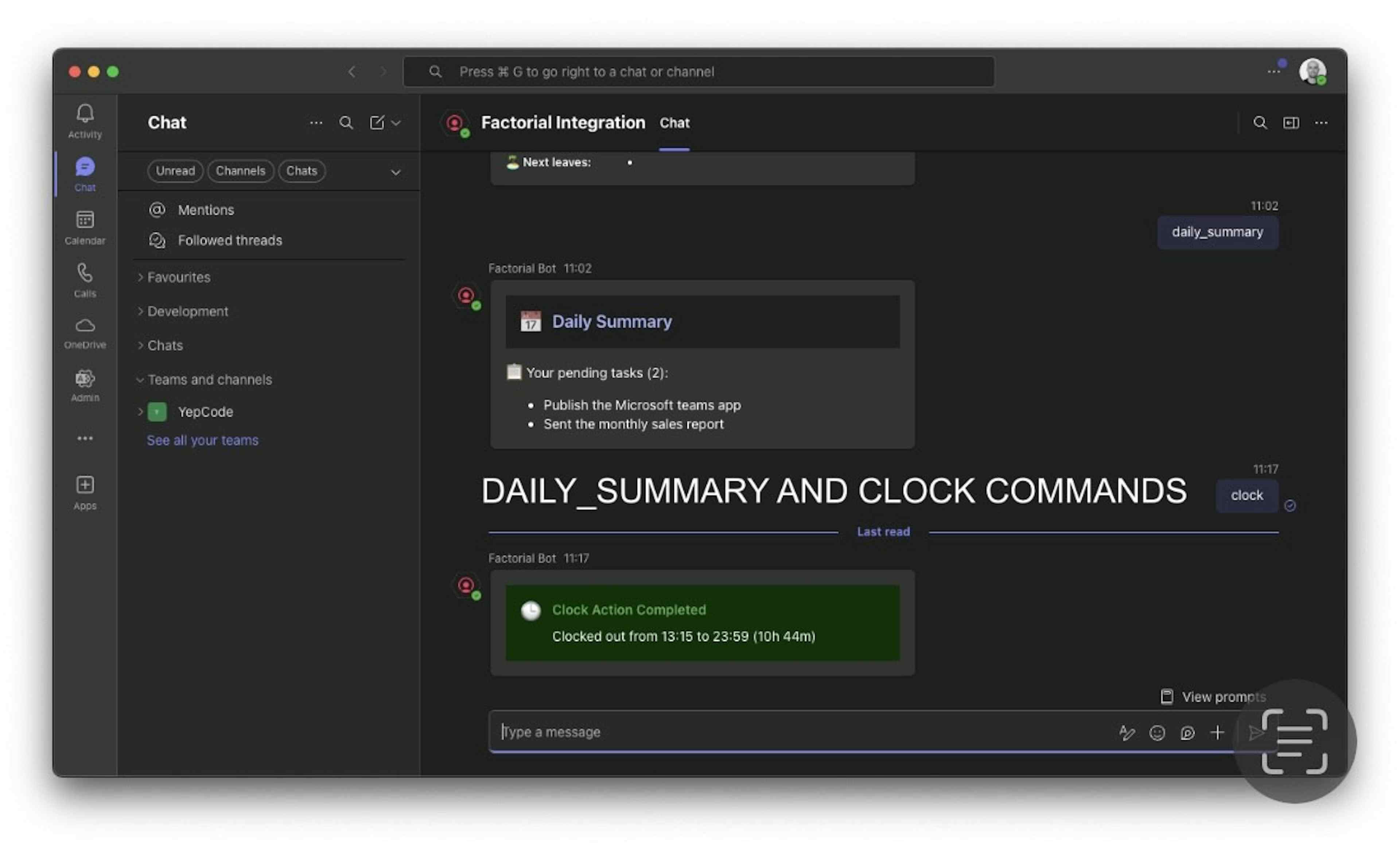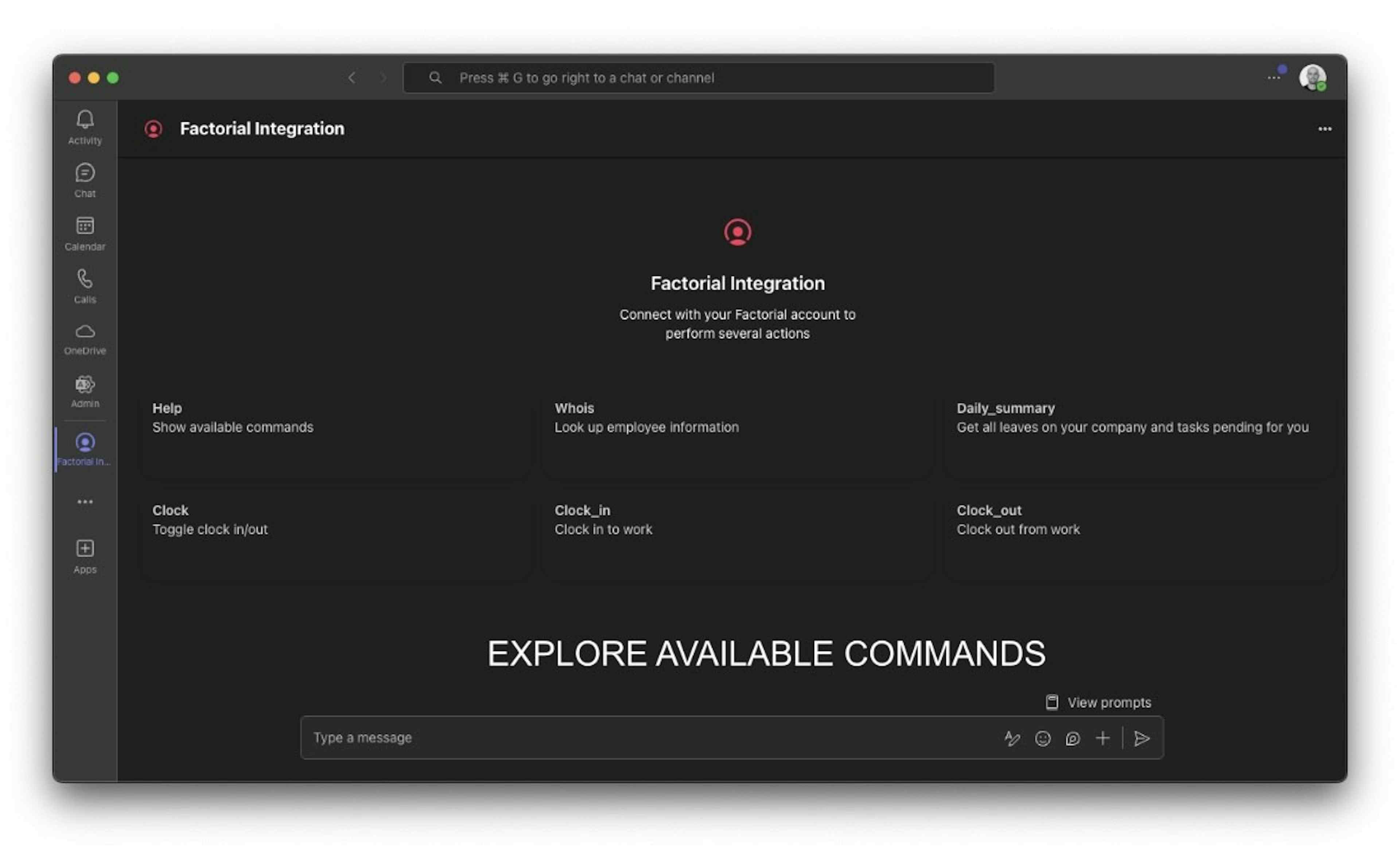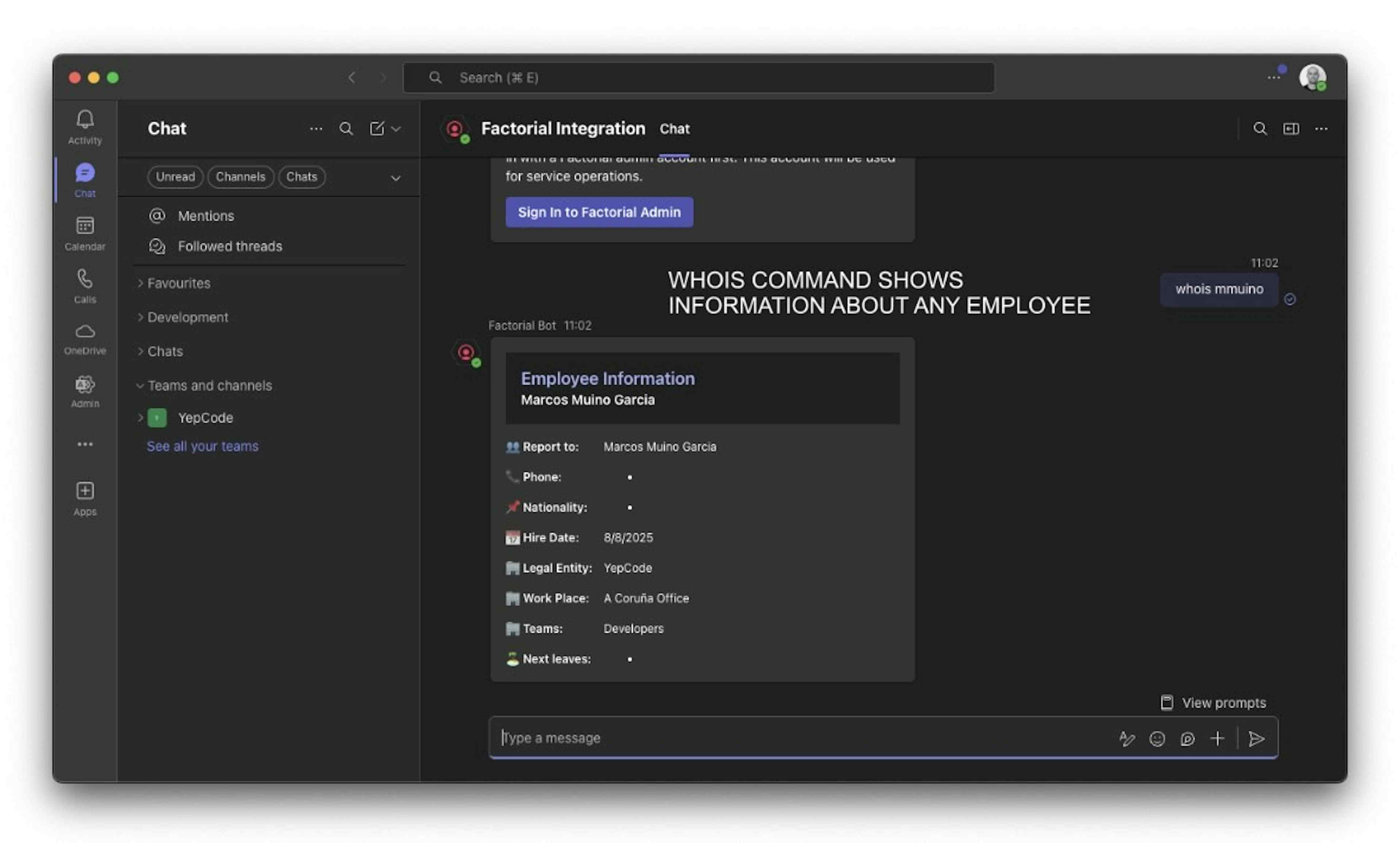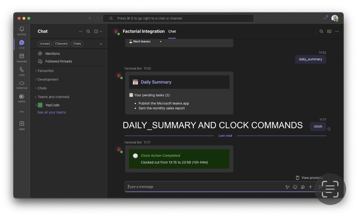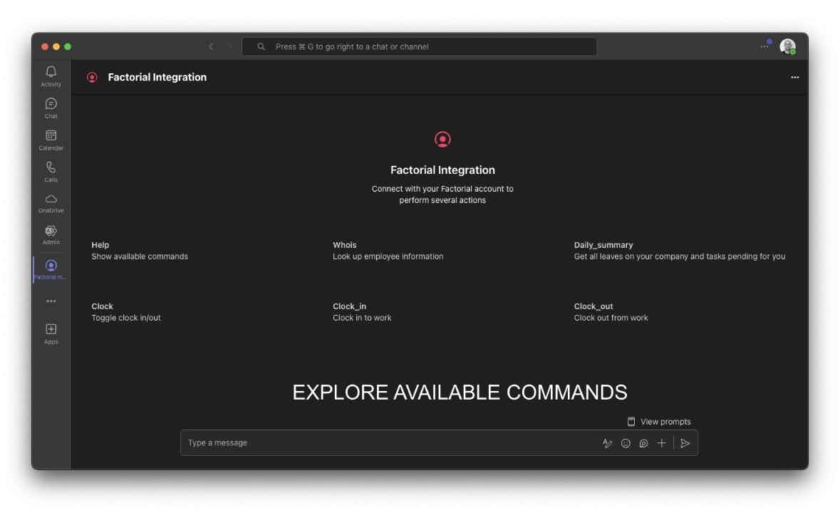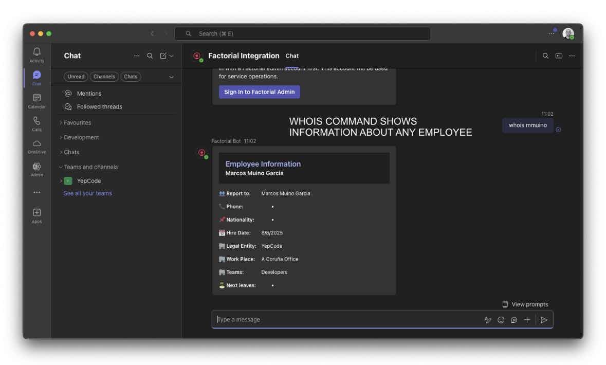 The Factorial Microsoft Teams Bot seamlessly integrates your Factorial HR system, enabling efficient workforce management directly from your Teams environment. Main Features