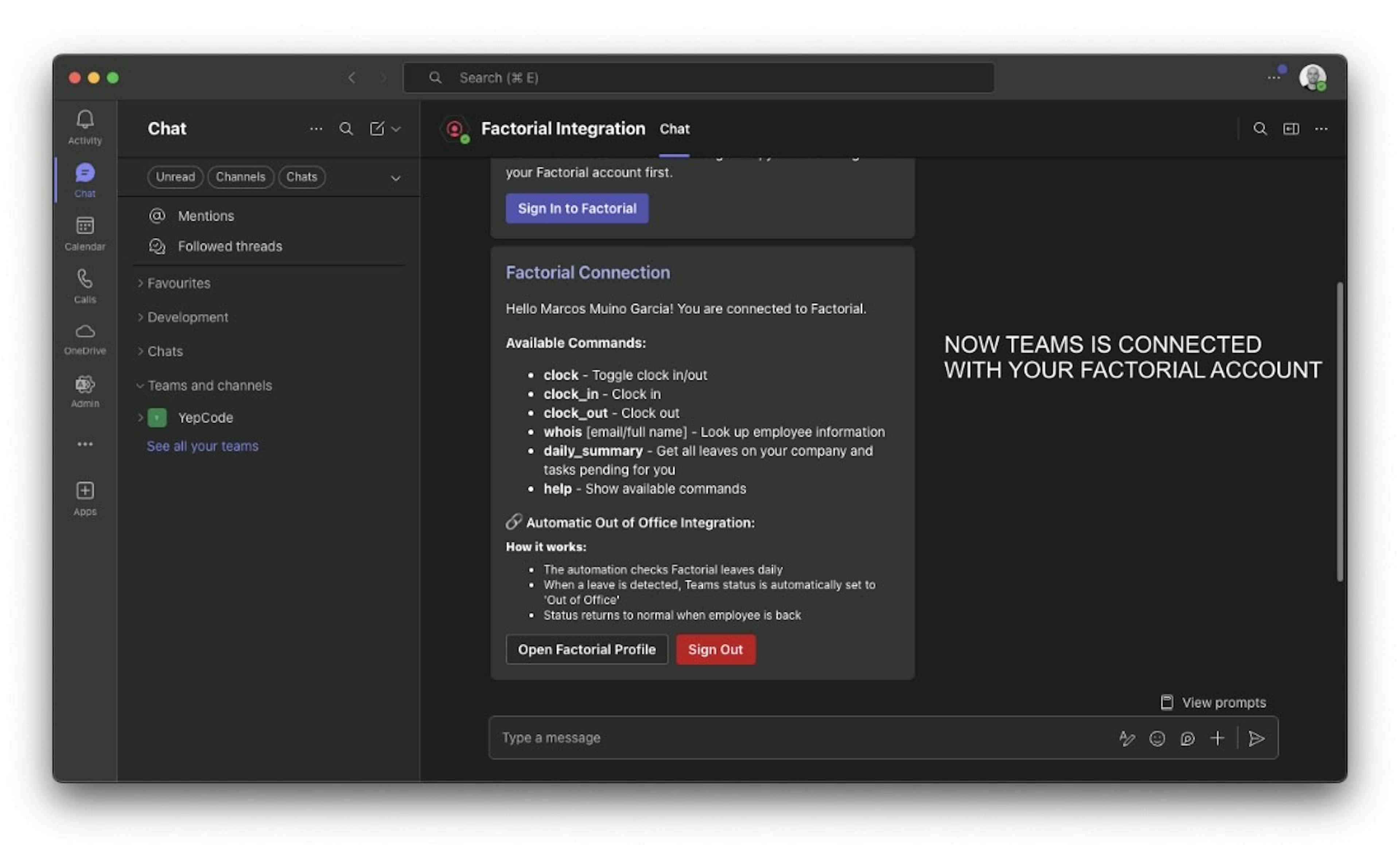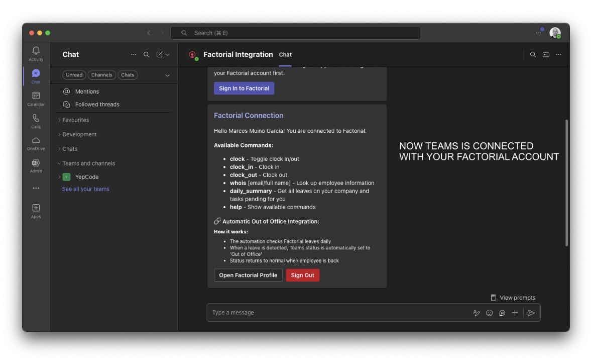 - Out-of-Office Integration: Automatically sync your Teams presence with Factorial leave status for seamless collaboration